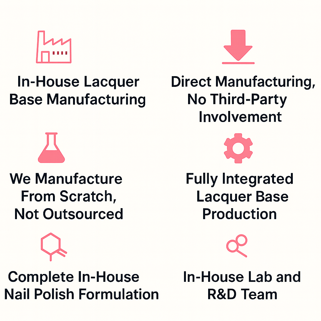 At Myra Marketing, we manufacture our nail polish lacquer base entirely in-house, starting from raw chemical components rather than using pre-made or outsourced formulations. This complete control over the base allows us to engineer custom formulations at a molecular level, ensuring safer, cleaner compositions free from harmful solvents such as acetone, toluene, and methanol. By developing the base internally, we are able to optimize viscosity, flow, pigment absorption, and gloss levels based on specific brand requirements. Our advanced dispersion process ensures higher pigment concentration, uniform color stability, and smooth application without issues like streaking, sagging, or flooding. Using specialized wetting and dispersing agents—including UG additives—we prevent pigment separation during storage, especially for shades containing carbon black, titanium oxide, or deep blue tones. This results in superior suspension performance and consistent shade uniformity throughout product shelf life.