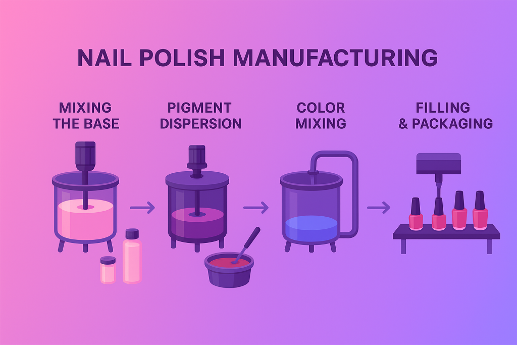 Our nail polish manufacturing process is a carefully engineered sequence designed to ensure precision, safety, and consistent product performance. We begin by preparing a clean, solvent-safe base using organic compounds that offer smooth viscosity, controlled flow, and enhanced adhesion. This base acts as the foundation for color development. Next, high-quality pigments undergo wetting and dispersion using advanced agents that prevent clumping, streaking, or settling. This stage ensures rich color depth, high opacity, and uniform application across all shades. Once pigments are fully dispersed, they are blended with the base to achieve the final formulation. Careful control of speed, temperature, and resin compatibility ensures the polish maintains optimal texture, gloss, and durability. The mixture is then transferred for quality checks where attributes such as drying time, stability, colour consistency, and wear resistance are evaluated. Finally, the finished nail polish is filled into bottles using automated systems that ensure hygiene, accurate volume, and spill-free sealing. Bottles are labelled, packaged, and prepared for distribution or private-label branding. Throughout the process, each batch is tested to maintain consistency and long-term shelf stability.